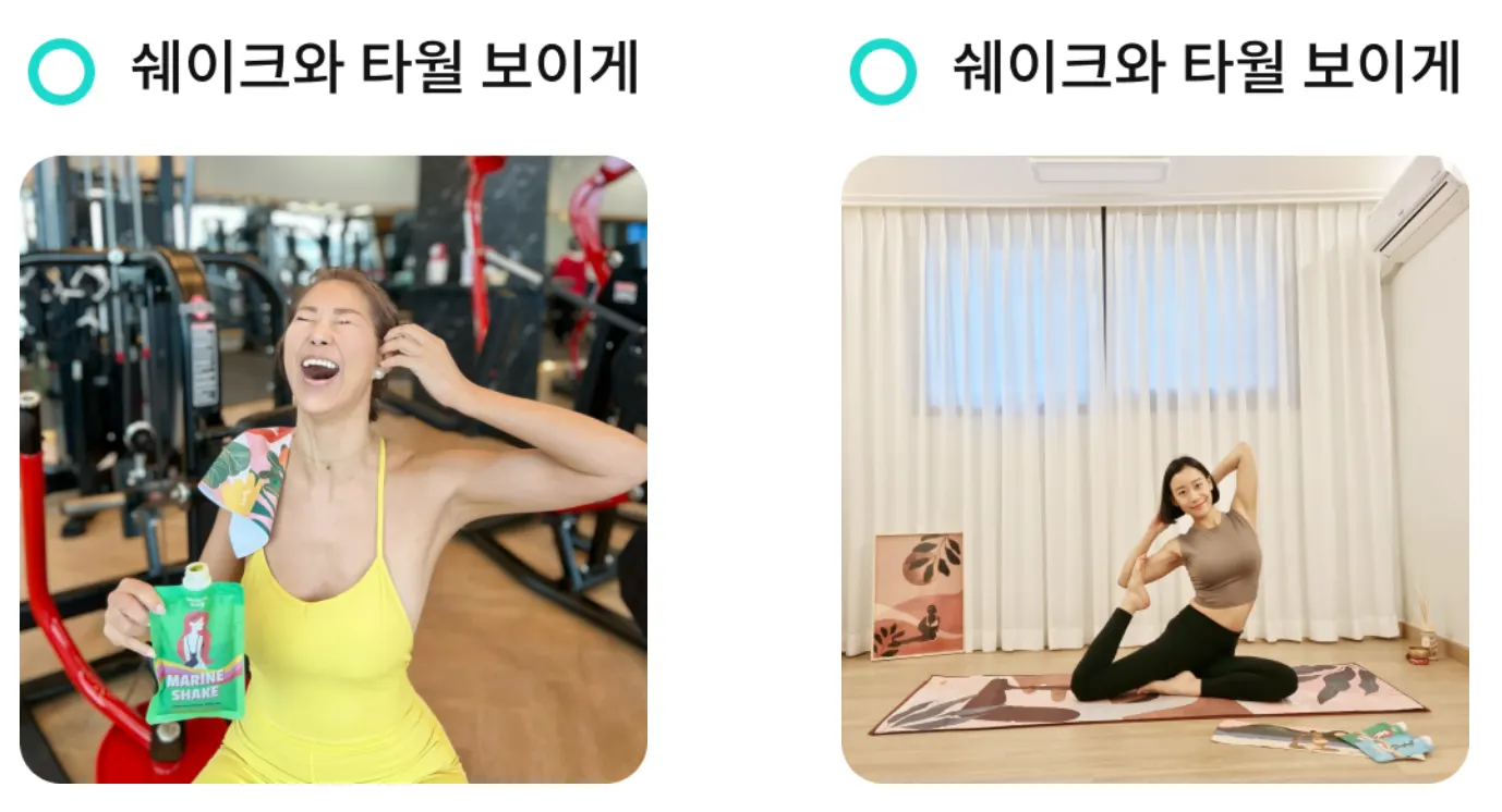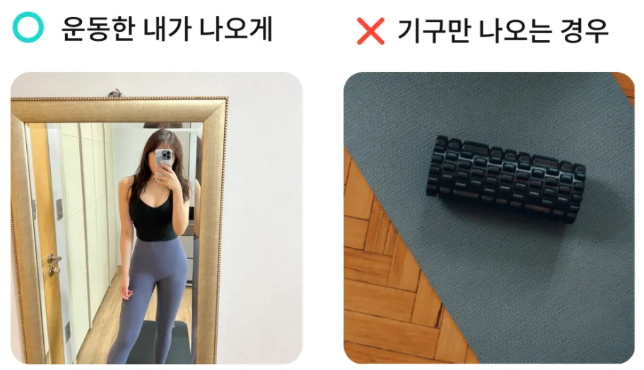 올바른 예시 : 헬스장, 운동장, 필라테스 센터 등 운동장소와 내가 보이게 찰칵!